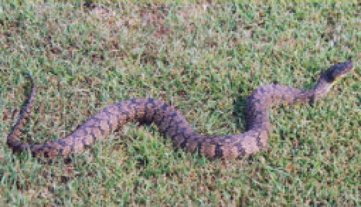 Common to the North Fork, this heavy bodied water snake is often confused the the highly venomous Cotton Mouth Water Moccasin. They are frequently killed on sight; which should not be done. These snakes have a bad temper and will run if pursued and bite and writh around if cornered. I see many of these snake about 18 inche long and their diamond pattern is very clear. Observe this snake and move on; please.
